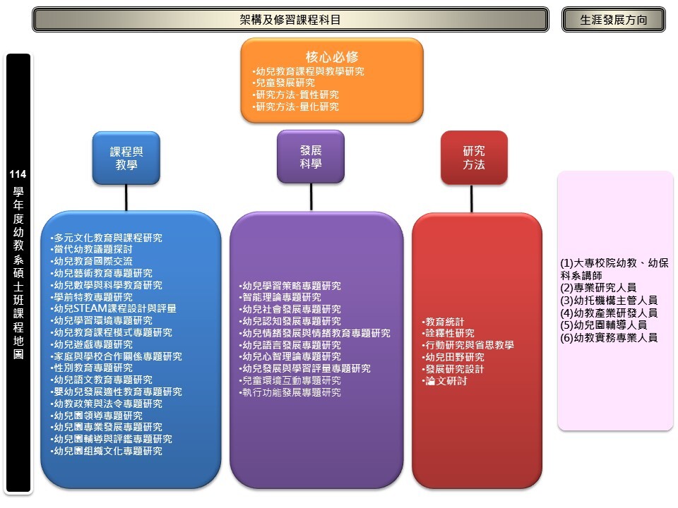 以培養幼教「課程與教學」及「發展科學」之進階研究與專業人才為宗旨,發展方向分為教學、研究、學術推廣與科技應用等四個向度,各項度目標分述如下: