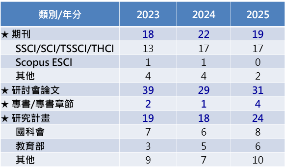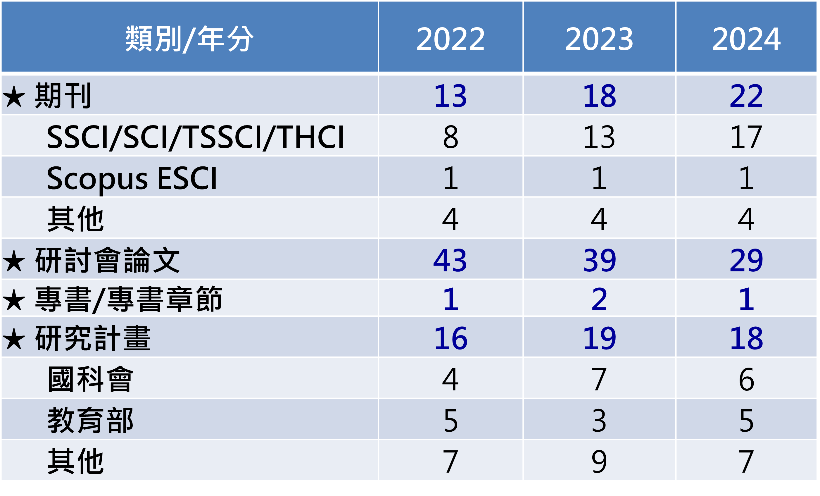 - 本系教師研究績效屢獲肯定,在學術研究上有相當豐碩成果,積極在國內外知名期刊(在SCI、SSCI等國際期刊及TSSCI、THCI等國內期刊)與研討會發表論文、執行國科會及教育部計畫案,並與產業界密切合作。近三年本系教師學術研究成果表現統計: