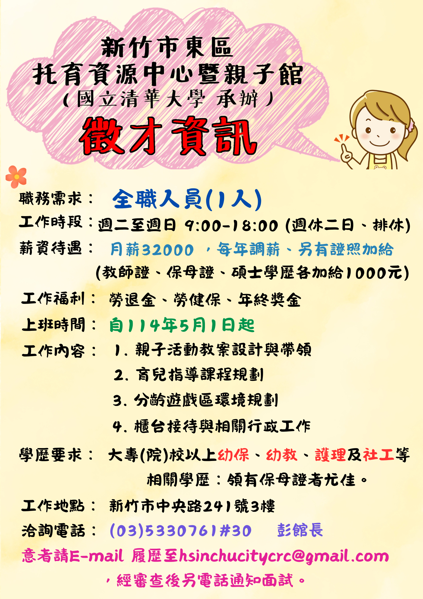 新竹市東區托育資源中心暨親子館徵才(全職人員)