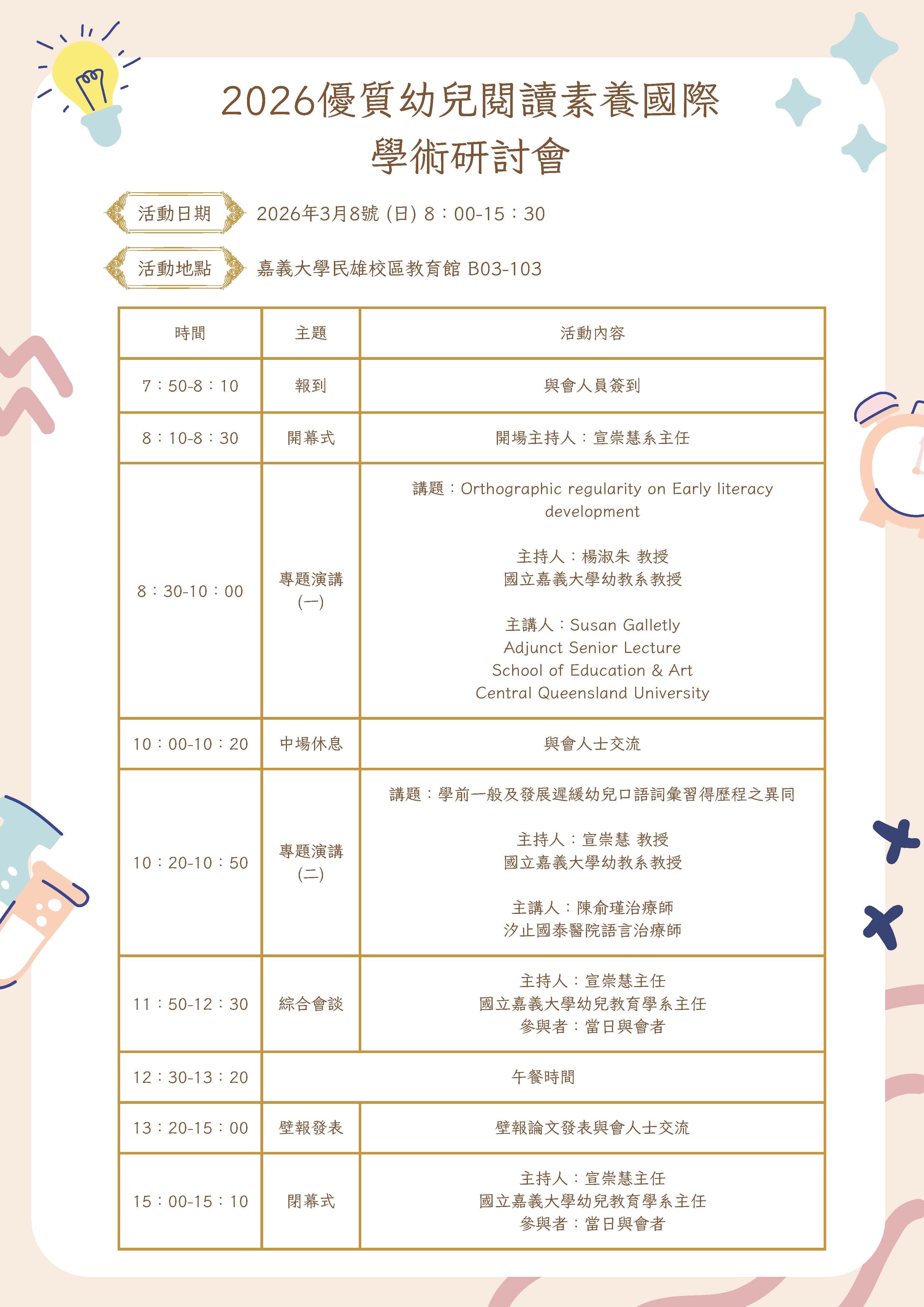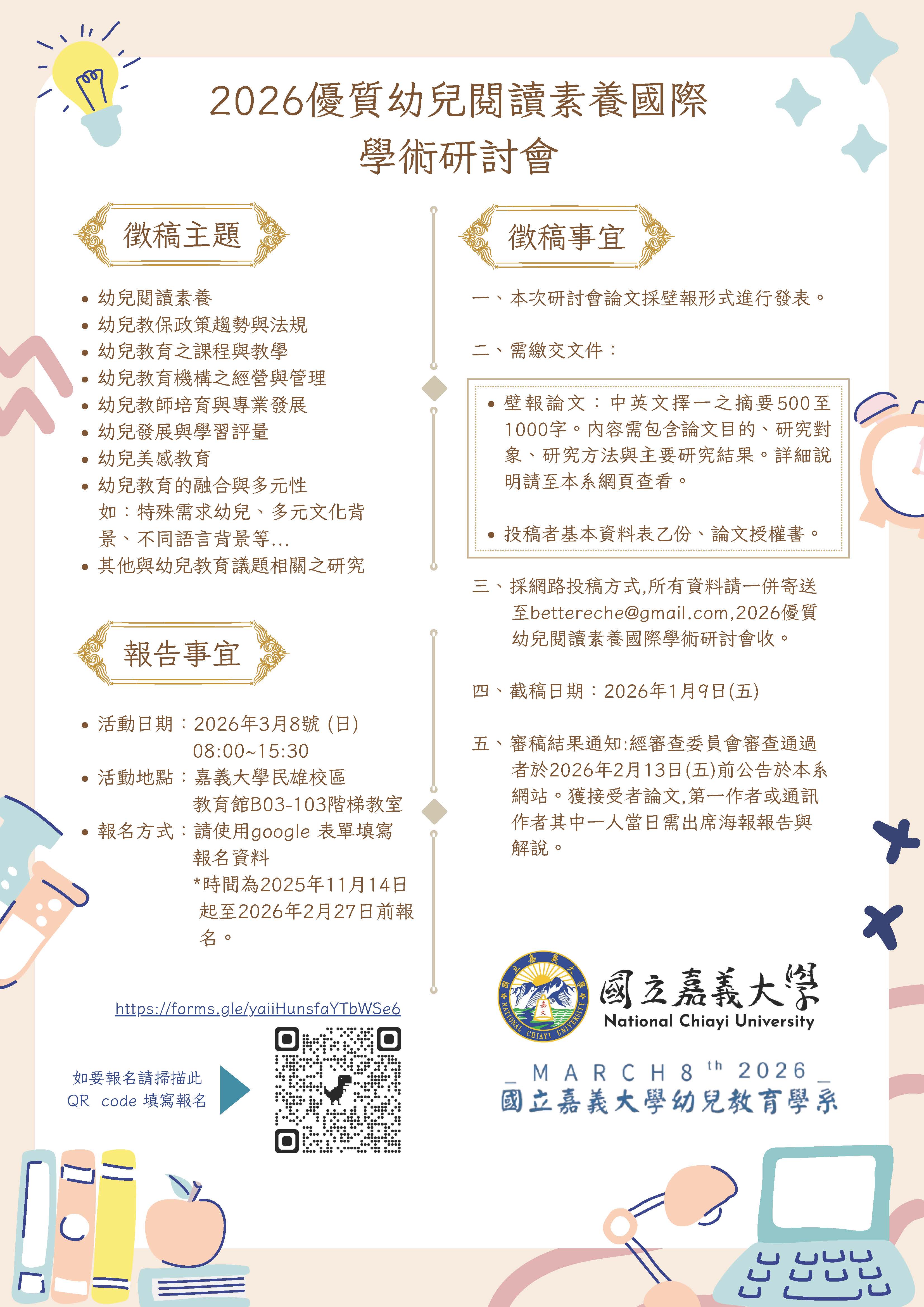 國立嘉義大學「2026年優質幼兒閱讀素養國際學術研討會」