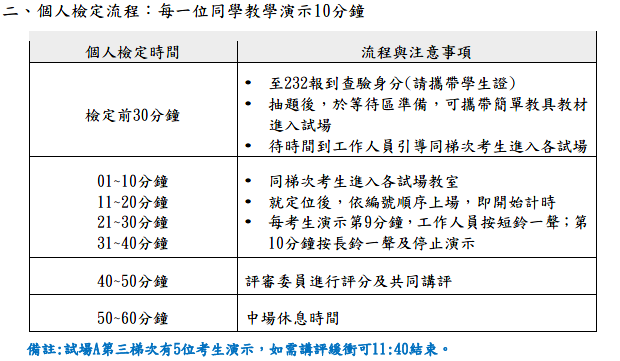- 同試場梯次考生全數演示完畢後,共同聆聽評委講評後離開。