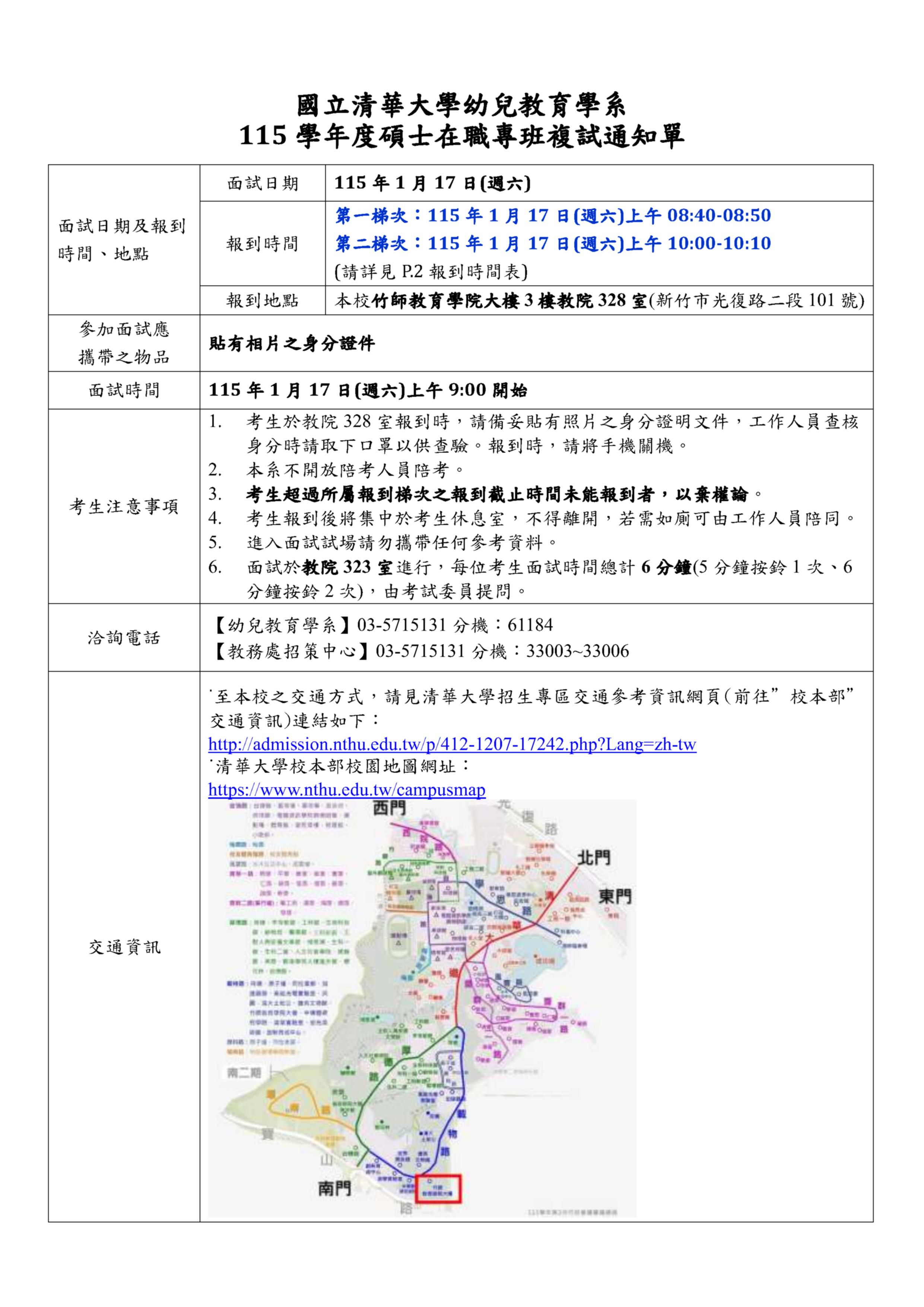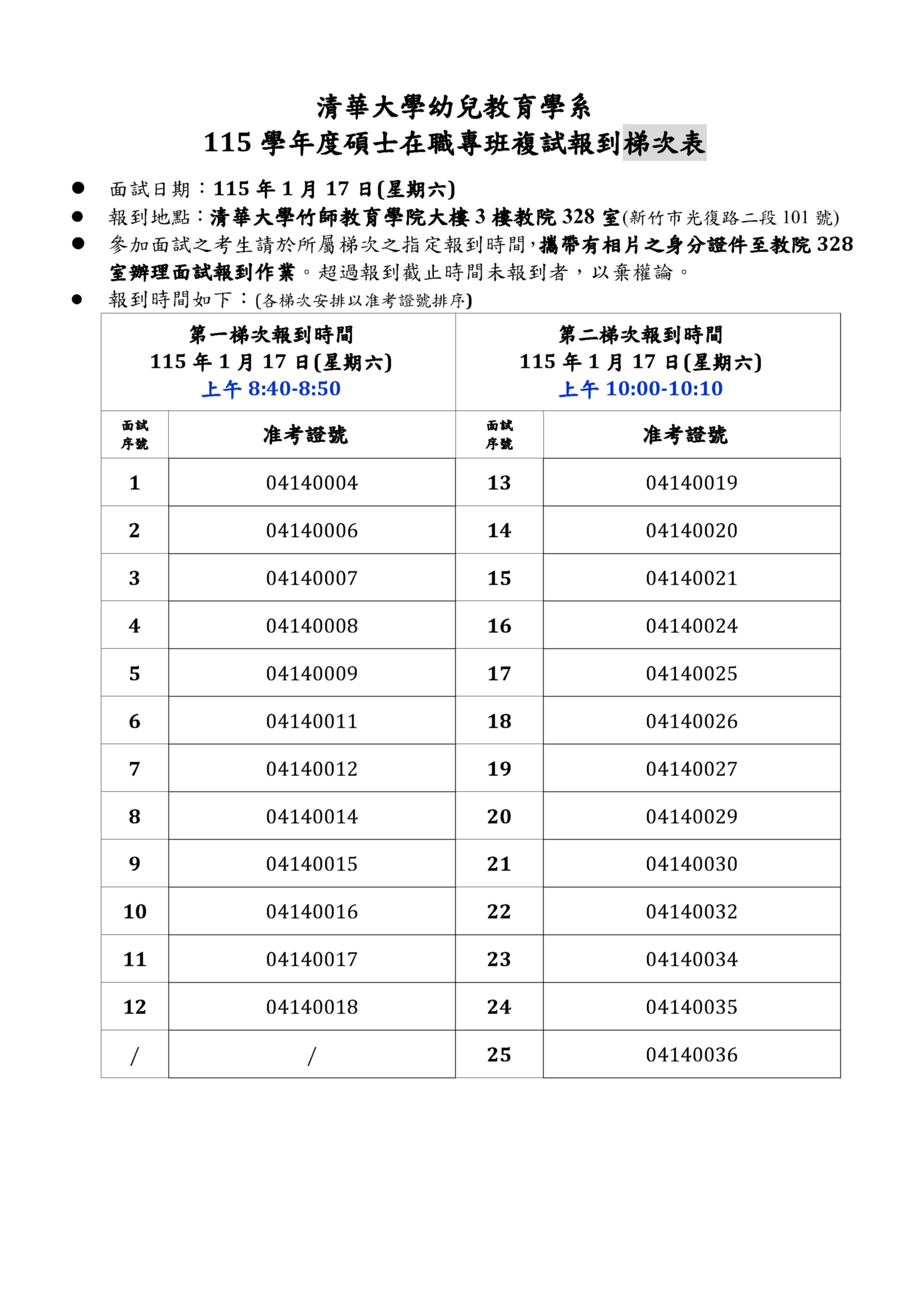 本系碩士在職專班招生複試(口試)於115年1月17日(六)舉行,請考生依指定報到時間,攜帶有相片之身分證件至本校校本部竹師教育學院大樓3樓教院328室(新竹市光復路二段101號)辦理口試報到作業。(考生超過指定報到時間未報到者,以棄權論。)