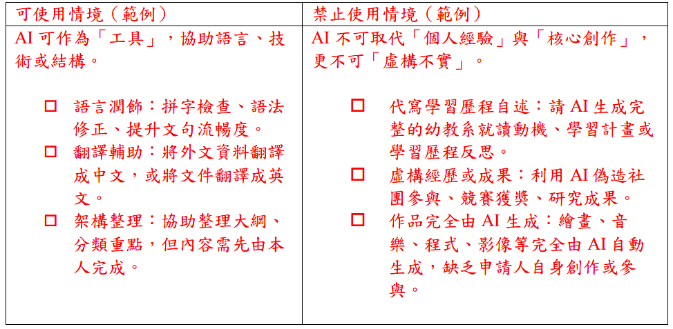 誠信是申請過程中最基本的原則。為維持審查評鑑的公平,請同學在書審資料中確認所提供資料的真實性,並聲明無虛構或誤導成分。 除純粹分析工具性質外,若同學使用生成式AI方案協助準備審查資料,請妥善保存相關的原始資料(如手稿、筆記、參考文獻或AI生成內容的提示紀錄)。必要時,審查委員得要求提供電子或實體格式的原始資料以供查驗,查驗過程將嚴格保護同學的隱私,僅在確認資料真實性時使用。