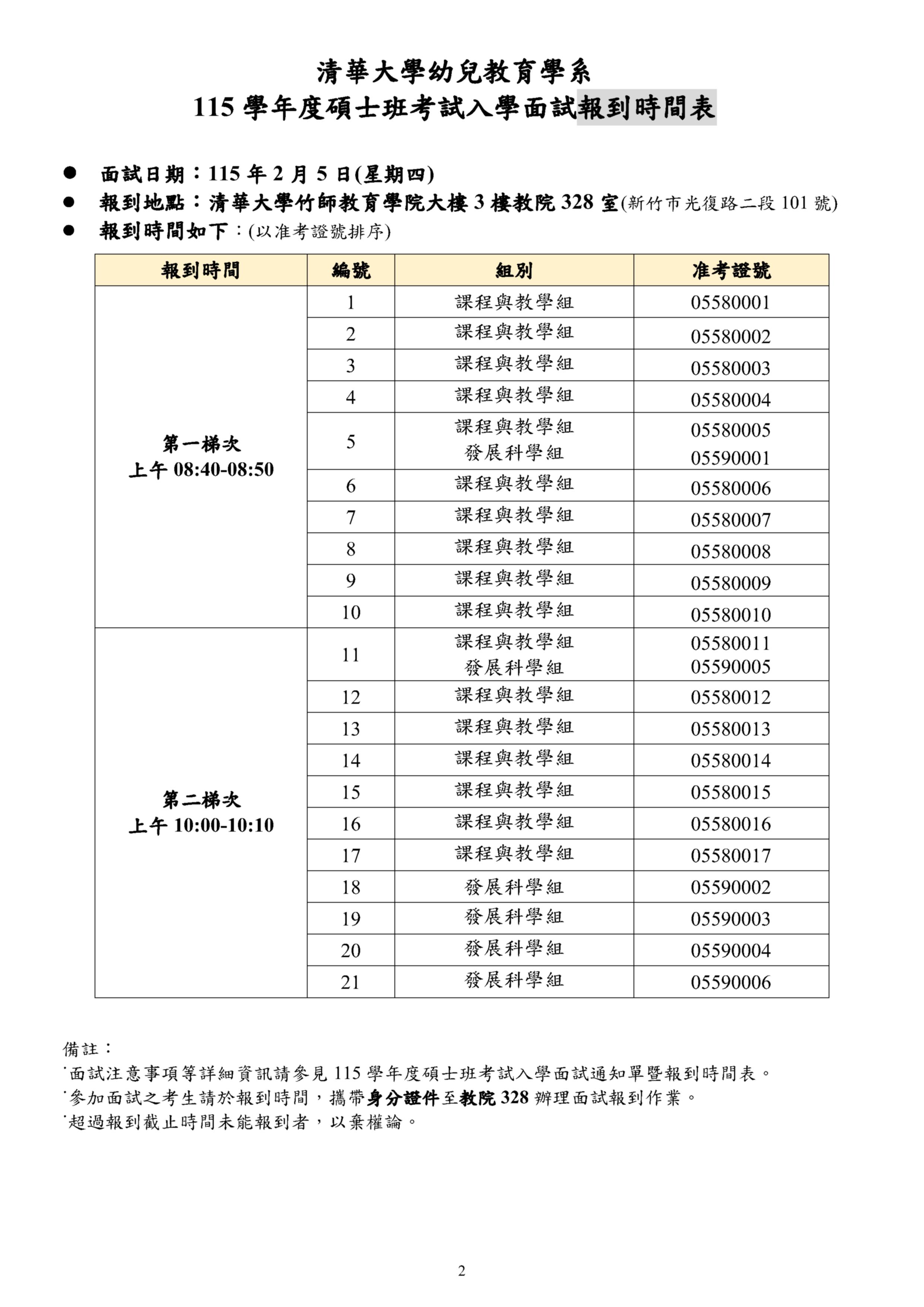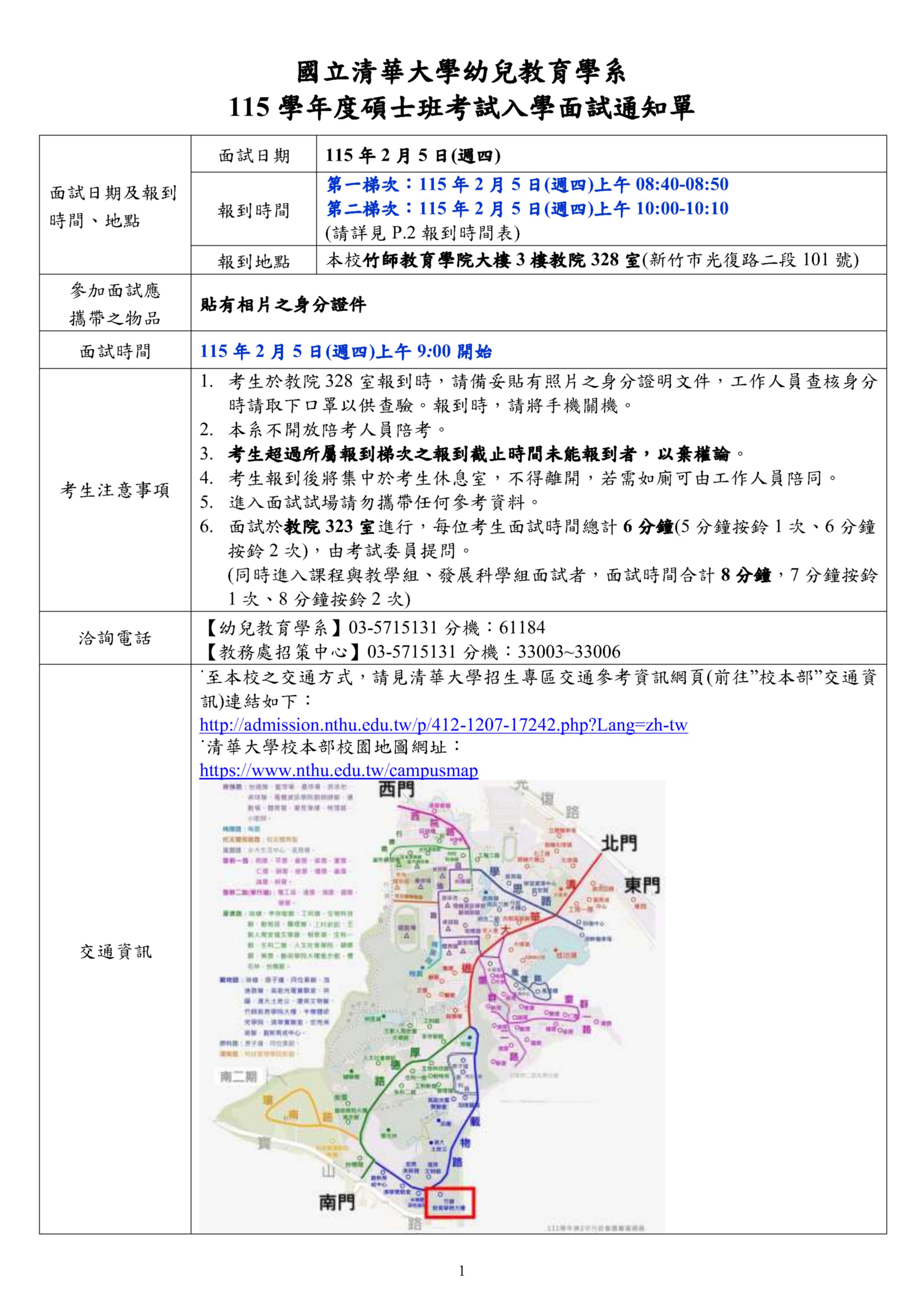 本系115學年度碩士班考試入學面試於115年2月5日(四)舉行,請考生依指定報到時間,攜帶有相片之身分證件至本校校本部竹師教育學院大樓3樓教院328室(新竹市光復路二段101號後校南門)辦理面試報到作業。(考生超過指定報到時間未報到者,以棄權論。)