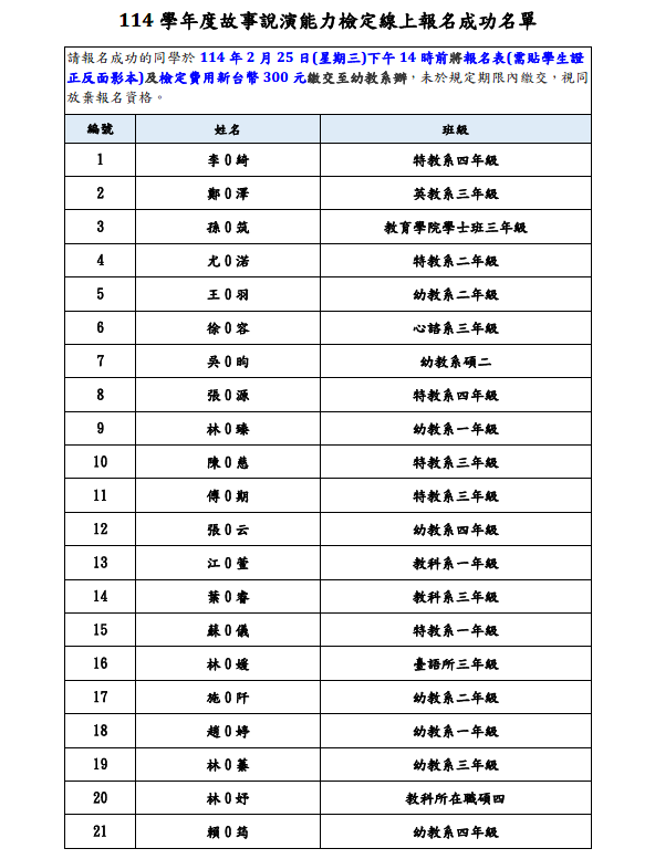 【1150320更新】114學年度故事說演能力檢定合格名單公告