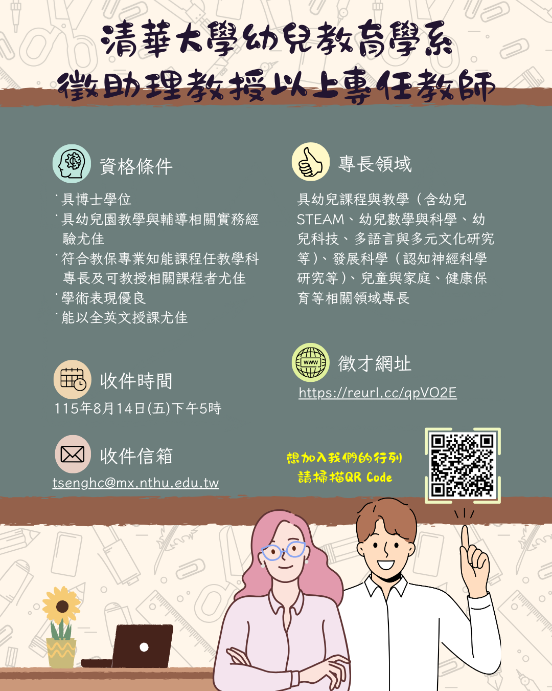 國立清華大學幼兒教育學系誠徵助理教授(含)以上專任教師(收件截止時間:115年8月14日)